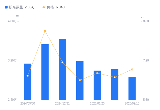 近一年(2024年9月30日至2025年9月10日),水发燃气A股股东户数从3.14万户,减低至2.86万户,降幅8.76%,区间股价上涨12.28%。