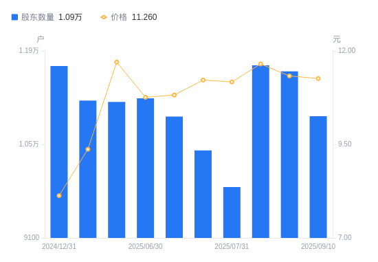 近一年(2024年9月30日至2025年9月10日),镇海股份A股股东户数从1.19万户,减低至1.09万户,降幅8.29%,区间股价上涨80.16%。