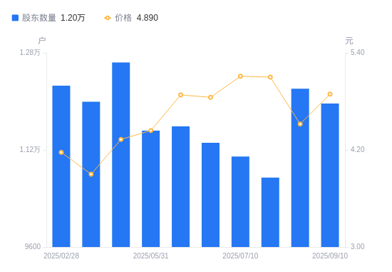 近一年(2024年9月30日至2025年9月10日),*ST三圣A股股东户数从1.12万户,增加至1.2万户,增幅6.54%,区间股价上涨75.90%。