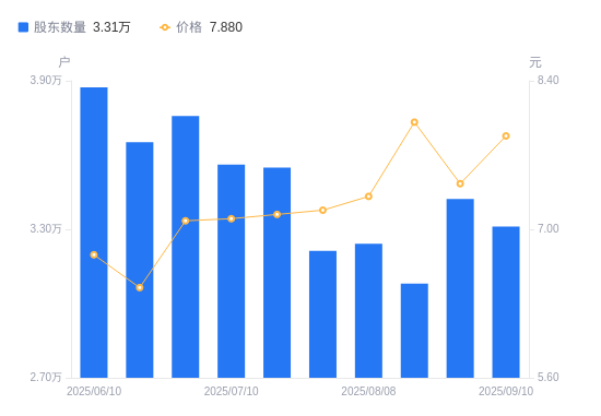 近一年(2024年9月20日至2025年9月10日),罗平锌电A股股东户数从3.44万户,减低至3.31万户,降幅3.72%,区间股价上涨64.51%。