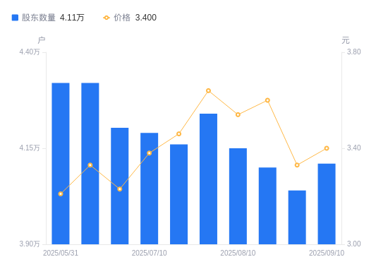 近一年(2024年9月30日至2025年9月10日),华仁药业A股股东户数从4.64万户,减低至4.11万户,降幅11.41%,区间股价上涨5.26%。