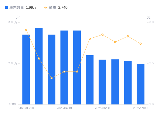 近一年(2024年9月30日至2025年9月10日),*ST节能A股股东户数从3.11万户,减低至1.99万户,降幅35.97%,区间股价下跌7.43%。