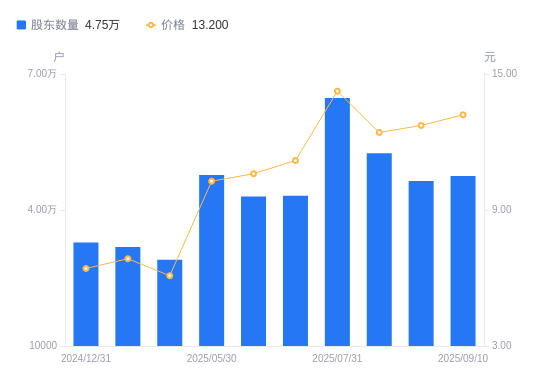 近一年(2024年9月30日至2025年8月30日),睿智医药A股股东户数从3.28万户,增加至4.64万户,增幅41.55%,区间股价上涨109.38%。