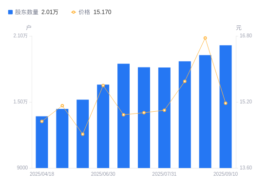 近一年(2024年9月30日至2025年8月29日),威星智能A股股东户数从1.48万户,增加至1.93万户,增幅29.98%,区间股价上涨37.41%。