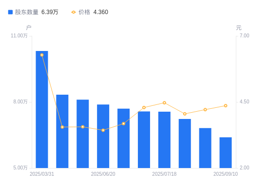 近一年(2024年9月30日至2025年9月10日),ST赛为A股股东户数从7.98万户,减低至6.39万户,降幅19.84%,区间股价下跌2.46%。