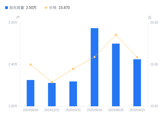 近一年(2024年9月30日至2025年9月15日),光力科技A股股东户数从2.1万户,增加至2.5万户,增幅18.87%,区间股价上涨21.80%。