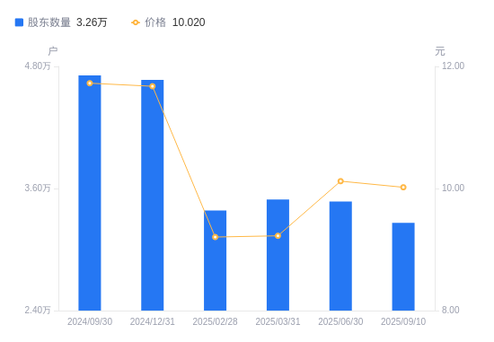 近一年(2024年9月30日至2025年9月10日),香溢融通A股股东户数从4.71万户,减低至3.26万户,降幅30.78%,区间股价下跌6.75%。