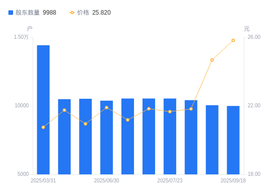 近一年(2024年9月30日至2025年9月18日),海川智能A股股东户数从9135户,增加至9988户,增幅9.34%,区间股价上涨89.16%。