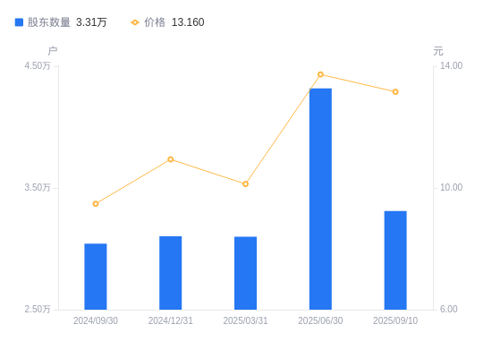 近一年(2024年9月30日至2025年9月10日),通达电气A股股东户数从3.04万户,增加至3.31万户,增幅8.81%,区间股价上涨49.89%。