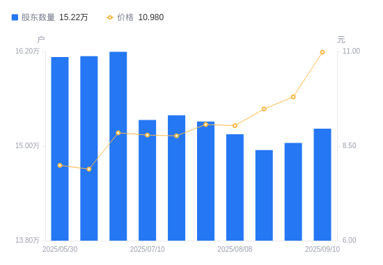 近一年(2024年9月10日至2025年9月10日),中国宝安A股股东户数从16.86万户,减低至15.22万户,降幅9.74%,区间股价上涨43.53%。