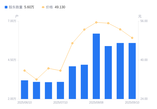 近一年(2024年9月10日至2025年8月29日),鼎捷数智A股股东户数从3.1万户,增加至5.6万户,增幅80.65%,区间股价上涨227.65%。