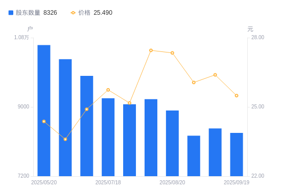 近一年(2024年9月30日至2025年9月19日),研奥股份A股股东户数从1.19万户,减低至8326户,降幅30.10%,区间股价上涨31.71%。