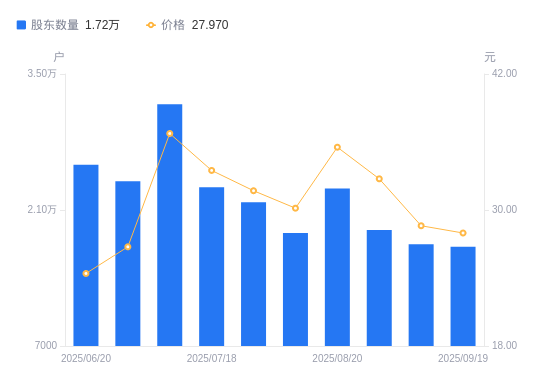 近一年(2024年9月30日至2025年9月19日),逸豪新材A股股东户数从1.39万户,增加至1.72万户,增幅23.74%,区间股价上涨59.10%。