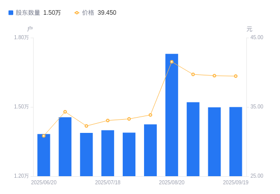 近一年(2024年9月30日至2025年9月19日),博硕科技A股股东户数从1.58万户,减低至1.5万户,降幅5.23%,区间股价上涨46.29%。