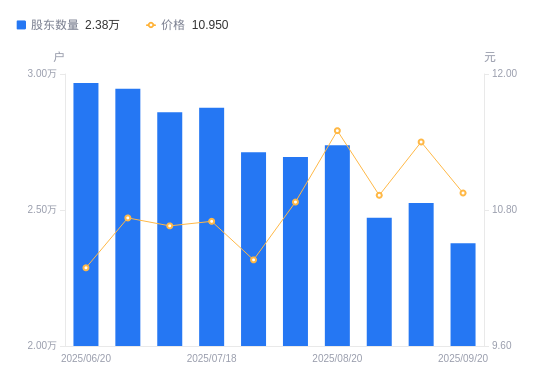 近一年(2024年9月30日至2025年9月20日),安纳达A股股东户数从2.4万户,减低至2.38万户,降幅1.03%,区间股价上涨17.11%。