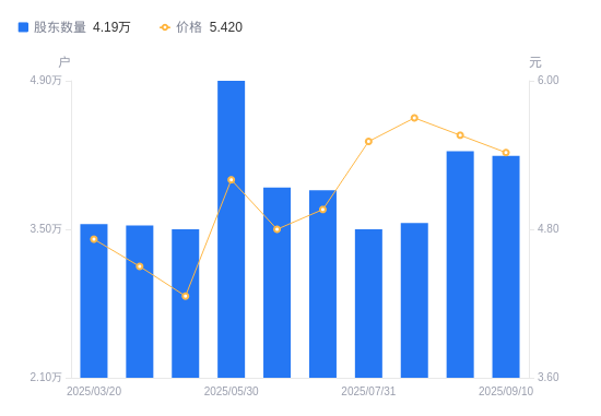 近一年(2024年9月30日至2025年8月29日),悦达投资A股股东户数从3.79万户,增加至4.24万户,增幅11.85%,区间股价上涨42.20%。