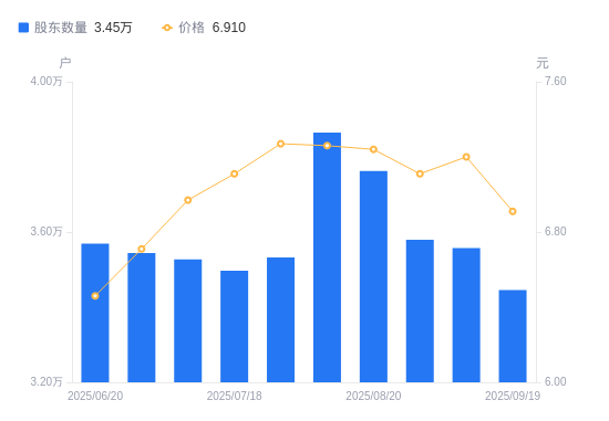9月22日消息,数据显示,截至2025年9月19日,金陵药业A股股东总户数为3.45万户,较上期(2025年9月10日)减少1123户,降幅3.16%。公司最新A股总股本为6.24亿股,其中流通A股5.9亿股,户均持有流通A股数量为1.71万股,较上期增加540.86股,增幅3.26%;户均持流通A股市值11.84万元,较上期减少1074.7元,降幅0.90%。