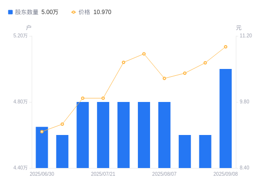 近一年(2024年9月20日至2025年9月19日),仙琚制药A股股东户数从2.4万户,增加至5万户,增幅108.33%,区间股价下跌9.31%。