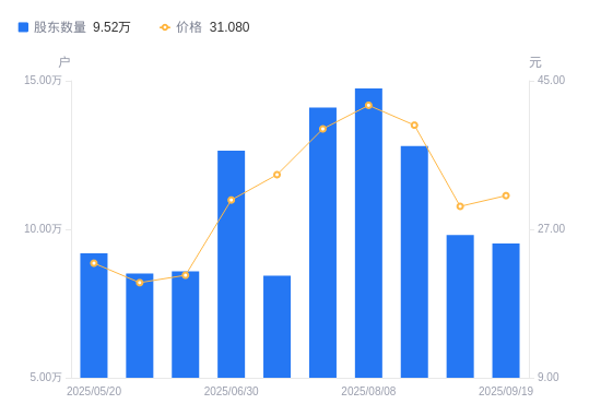 近一年(2024年9月30日至2025年9月19日),建设工业A股股东户数从2.92万户,增加至9.52万户,增幅226.51%,区间股价上涨222.41%。