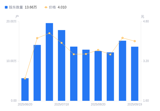 近一年(2024年9月20日至2025年9月19日),大东南A股股东户数从6.26万户,增加至13.66万户,增幅118.19%,区间股价上涨112.17%。
