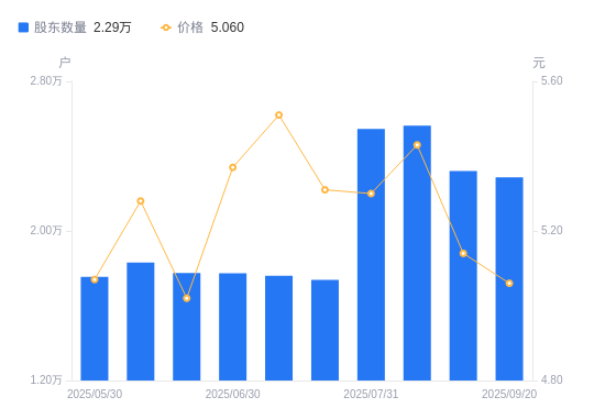 近一年(2024年9月30日至2025年9月20日),同德化工A股股东户数从1.77万户,增加至2.29万户,增幅29.10%,区间股价上涨7.66%。