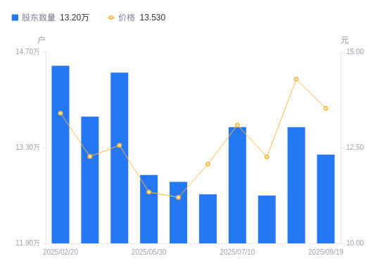近一年(2024年9月30日至2025年9月19日),中粮资本A股股东户数从7.07万户,增加至13.2万户,增幅86.71%,区间股价上涨27.14%。