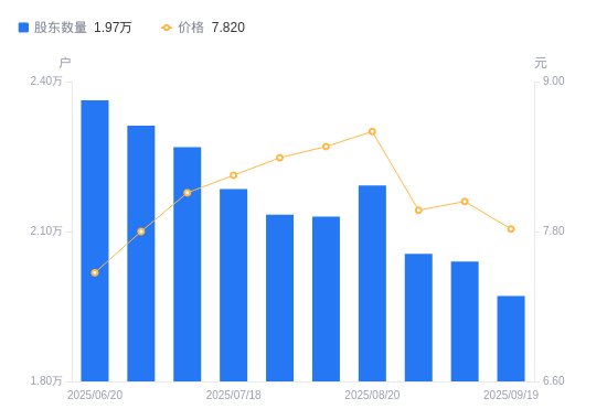 近一年(2024年9月20日至2025年9月19日),益盛药业A股股东户数从2.31万户,减低至1.97万户,降幅14.52%,区间股价上涨31.87%。