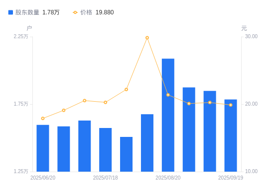 近一年(2024年9月20日至2025年9月19日),金利华电A股股东户数从8753户,增加至1.78万户,增幅103.90%,区间股价上涨69.05%。