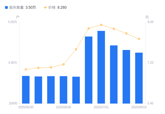 近一年(2024年9月30日至2025年9月19日),三和管桩A股股东户数从2.4万户,增加至3.5万户,增幅45.84%,区间股价上涨43.65%。