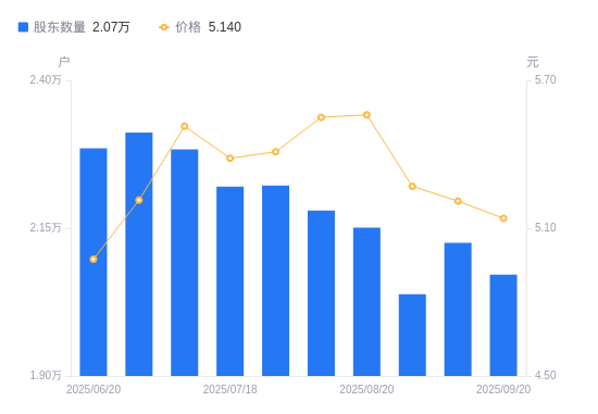 近一年(2024年9月20日至2025年9月20日),中建环能A股股东户数从2.09万户,减低至2.07万户,降幅0.83%,区间股价上涨30.99%。