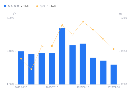 近一年(2024年9月20日至2025年9月20日),丝路视觉A股股东户数从2.67万户,减低至2.16万户,降幅19.13%,区间股价上涨20.53%。
