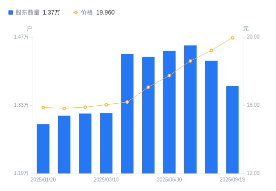 近一年(2024年9月20日至2025年9月19日),丽臣实业A股股东户数从1.41万户,减低至1.37万户,降幅2.71%,区间股价上涨57.66%。