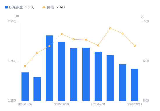 9月22日消息,数据显示,截至2025年9月19日,德艺文创A股股东总户数为1.65万户,较上期(2025年9月10日)减少574户,降幅3.36%。公司最新A股总股本为3.11亿股,其中流通A股2.21亿股,户均持有流通A股数量为1.34万股,较上期增加448.01股,增幅3.47%;户均持流通A股市值8.53万元,较上期减少1137.48元,降幅1.32%。