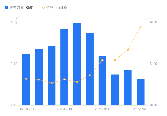 近一年(2024年9月30日至2025年9月19日),开润股份A股股东户数从6587户,增加至8581户,增幅30.27%,区间股价上涨20.27%。