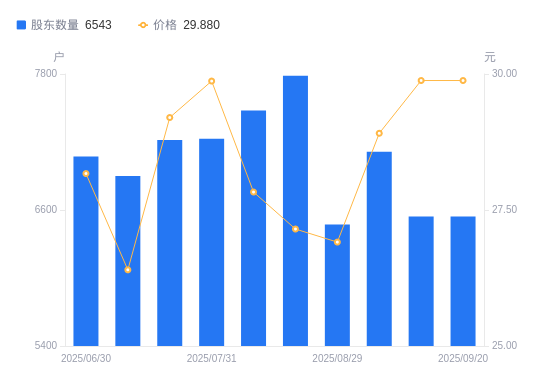 近一年(2024年9月20日至2025年9月19日),实朴检测A股股东户数从1.33万户,减低至6543户,降幅50.79%,区间股价上涨198.80%。