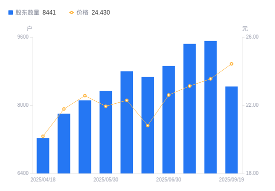 近一年(2024年9月30日至2025年9月19日),双枪科技A股股东户数从7928户,增加至8441户,增幅6.47%,区间股价上涨56.78%。