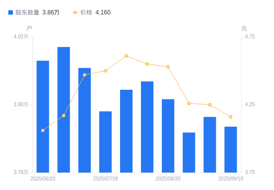 近一年(2024年9月20日至2025年9月19日),津药药业A股股东户数从4.24万户,减低至3.86万户,降幅8.99%,区间股价上涨13.60%。