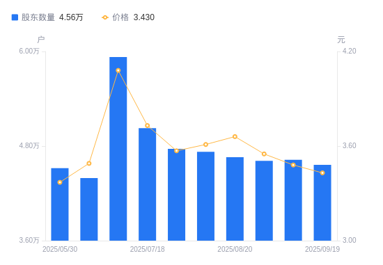 近一年(2024年9月20日至2025年9月19日),新能泰山A股股东户数从4.59万户,减低至4.56万户,降幅0.57%,区间股价上涨37.75%。