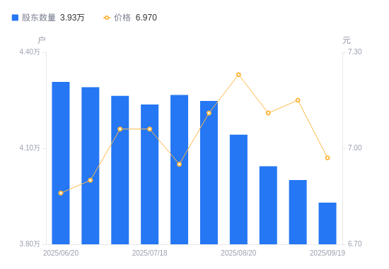 近一年(2024年9月20日至2025年9月19日),四川美丰A股股东户数从4.74万户,减低至3.93万户,降幅17.01%,区间股价上涨10.46%。