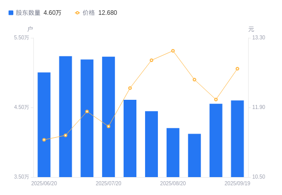 近一年(2024年9月30日至2025年9月19日),淮北矿业A股股东户数从2.55万户,增加至4.6万户,增幅80.60%,区间股价下跌19.44%。