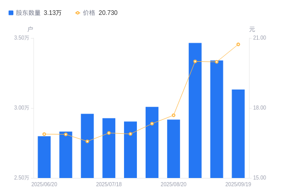 近一年(2024年9月20日至2025年9月19日),美亚光电A股股东户数从2.71万户,增加至3.13万户,增幅15.46%,区间股价上涨74.94%。