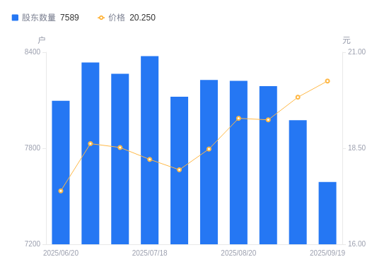 9月22日消息,数据显示,截至2025年9月19日,*ST声迅(维权)A股股东总户数为7589户,较上期(2025年9月10日)减少386户,降幅4.84%。公司最新A股总股本为8186.16万股,其中流通A股6579.93万股,户均持有流通A股数量为8670.35股,较上期增加419.66股,增幅5.09%;户均持流通A股市值17.56万元,较上期增加1.2万元,增幅7.31%。