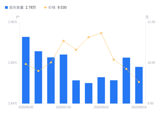 近一年(2024年9月30日至2025年9月19日),克明食品A股股东户数从3.18万户,减低至2.78万户,降幅12.43%,区间股价上涨9.84%。