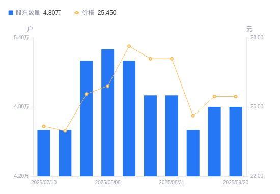 近一年(2024年9月20日至2025年9月19日),中颖电子A股股东户数从4.5万户,增加至4.8万户,增幅6.67%,区间股价上涨47.36%。