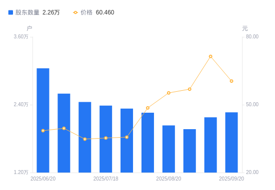 近一年(2024年9月20日至2025年9月20日),海辰药业A股股东户数从1.8万户,增加至2.26万户,增幅25.58%,区间股价上涨230.20%。