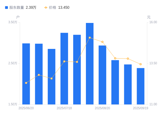 近一年(2024年9月30日至2025年9月19日),润都股份A股股东户数从1.38万户,增加至2.39万户,增幅72.93%,区间股价上涨53.36%。
