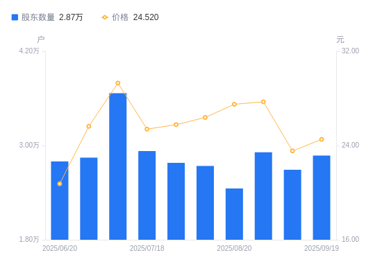 近一年(2024年9月30日至2025年9月19日),广信材料A股股东户数从3.2万户,减低至2.87万户,降幅10.18%,区间股价上涨51.73%。