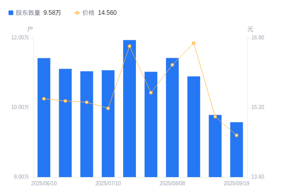 近一年(2024年9月20日至2025年9月19日),襄阳轴承A股股东户数从5.17万户,增加至9.58万户,增幅85.27%,区间股价上涨185.49%。