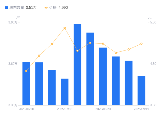 近一年(2024年9月20日至2025年9月19日),欣龙控股A股股东户数从4.21万户,减低至3.51万户,降幅16.58%,区间股价上涨49.85%。
