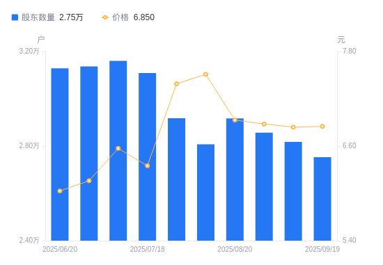 近一年(2024年9月20日至2025年9月19日),新筑股份A股股东户数从3.24万户,减低至2.75万户,降幅14.97%,区间股价上涨68.30%。